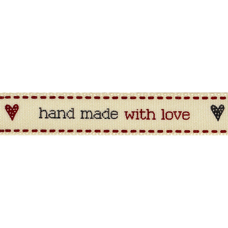 This natural ribbon has a printed stitched effect border with brick red and coal black hearts and retro text.